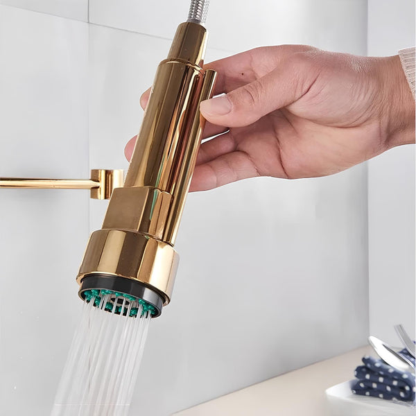 Torneira Gourmet Gold, a nossa queridinha, vem agora com uma cor espetacular, deixando sua Cozinha ou Área Gourmet ainda mais exclusiva e do jeito que sonhou, possui duas saída de jato (Arejado ou Ducha/Chuveirinho) indispensáveis na higienização dos alimentos ou louça. Monocomando com Água Quente e Fria.